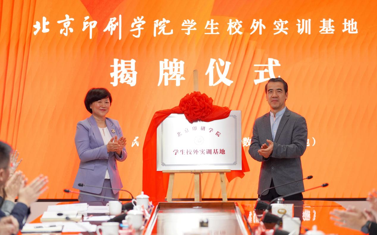 田忠利与李翠玲代表双方共同签署北京印刷学院与新疆人民出版社(新疆少数民族出版基地)共建协议,并为“北京印刷学院学生校外实训基地”揭牌。双方将在在科学互促、业务互助、项目互建、人才互动等方面开展深入合作。