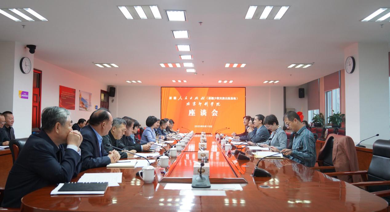 为进一步聚焦中国特色国际知名出版大学建设目标,立足出版印刷行业转型升级,发挥特色学科专业优势,服务文化强国建设,体现服务社会担当,9月15日,学校党委副书记、院长田忠利应邀带队赴新疆人民出版社走访调研,学校副院长陈丹,原党委常委、副院长、二级教授王关义,对外合作交流处、设计艺术学院负责人一同参加。新疆人民出版社党委书记、总编辑李翠玲,社长阿不都热依木·哈力克热情接待了学校一行。学校与新疆人民出版社(新疆少数民族出版基地)签署共建协议,“北京印刷学院学生校外实训基地”揭牌。十余名在社工作的北印校友共同参加了座谈活动。
